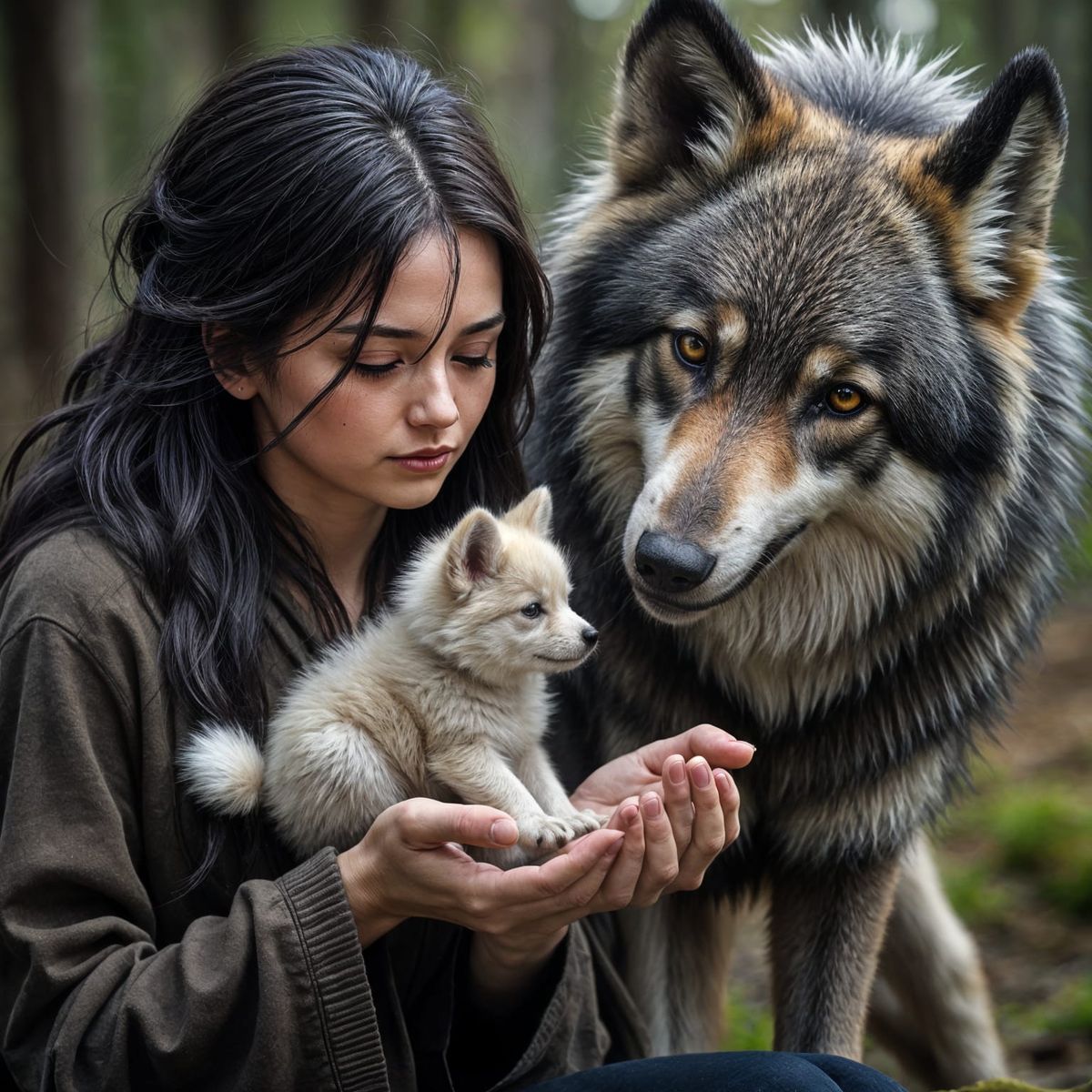 A photorealistic image shows a woman holding a small dire wolf puppy in her hand. A protective mother dire wolf watches over them with natural lighting and sharp focus.