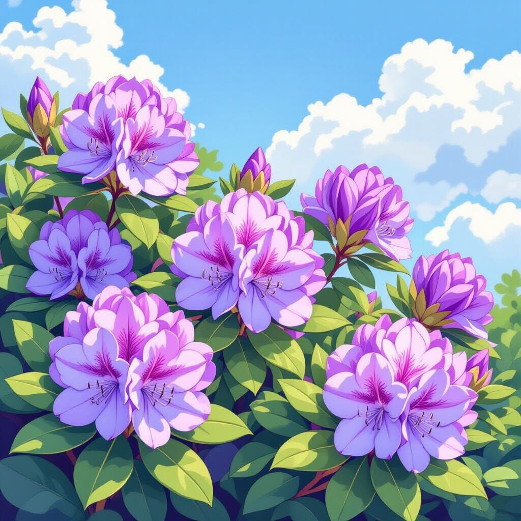 This image shows vibrant rhododendron flowers in full bloom against a blue sky. The artwork is reminiscent of watercolor paintings, with lush colors and smooth gradients.