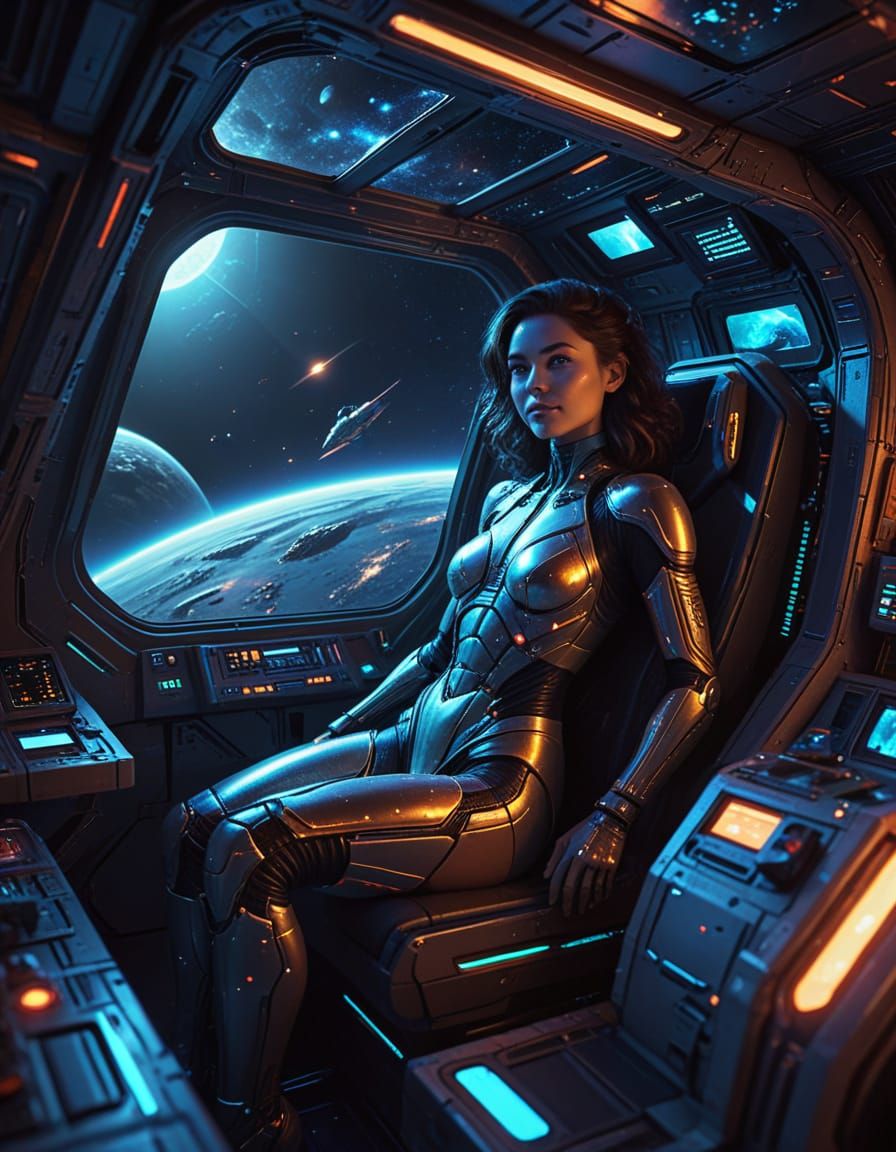 This image shows a medium shot of a joyful Pleiadian woman in a spaceship cockpit. Digital art evokes a futuristic sci-fi aesthetic with cosmic lighting and intricate details.