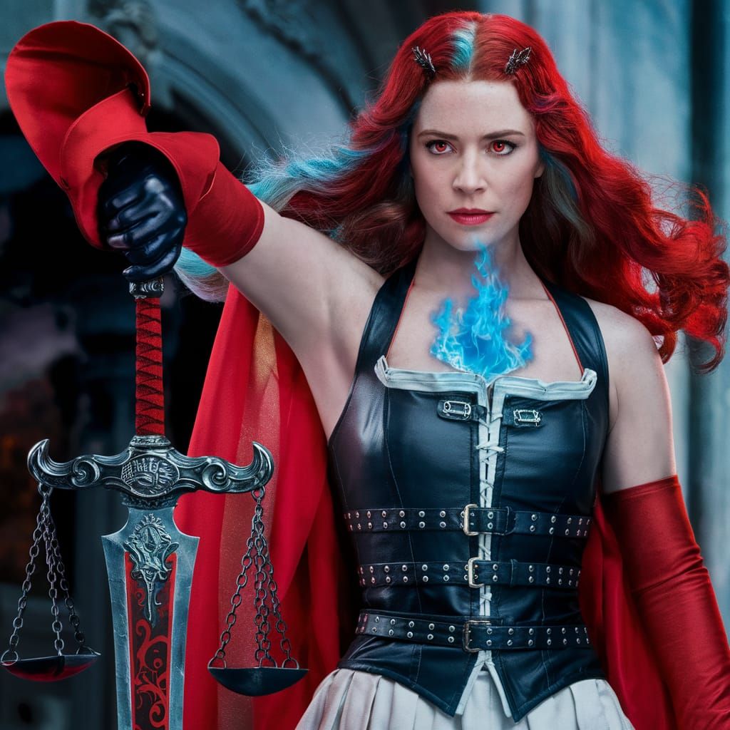 A dramatic image of Elizabeth Rose Bloodflame, a strong heroine with a fiery spirit, wielding a sword and adorned in a striking black and white costume with red accents, set against a cinematic backdrop.