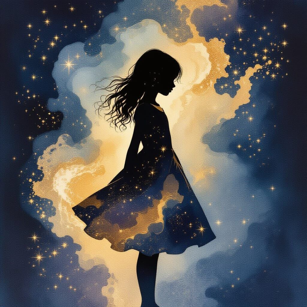 This image features a girl's silhouette in a dress adorned with cosmic gold watercolor washes and swirling nebula patterns. The background is deep indigo with stardust, creating a dreamlike, ethereal quality.