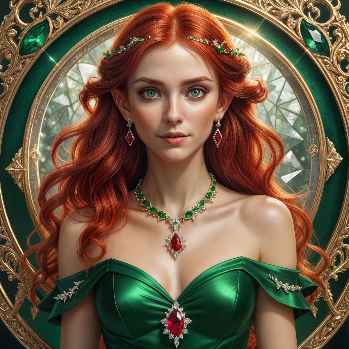 This image shows a realistic portrait of a 20-year-old elf woman with ruby red hair, emerald green eyes and pale skin. She wears a green silk corset and a ruby pendant.