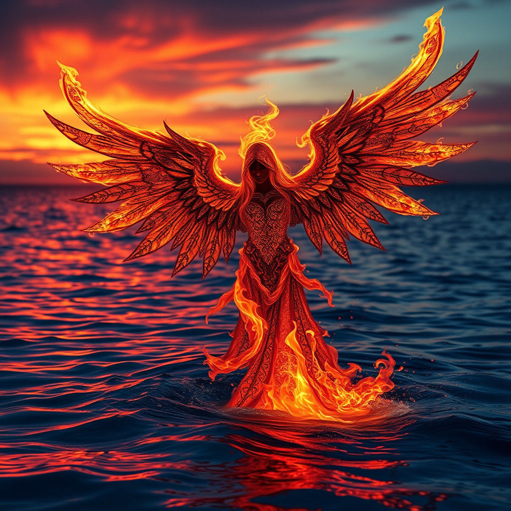 A striking picture of a gothic angel made of flames rising from water. The digital art features intricate details and a dramatic, high-contrast film noir aesthetic with vibrant colors.