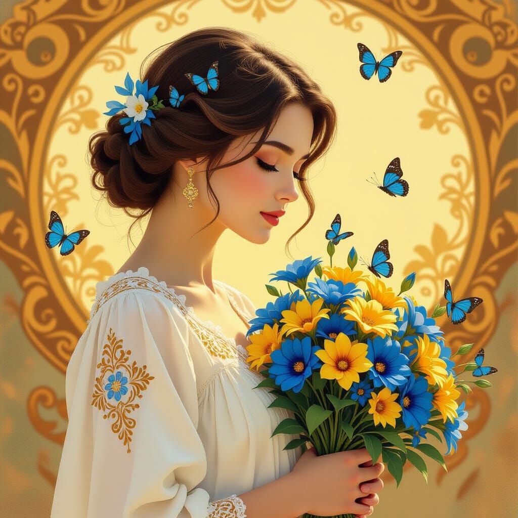 A captivating image of a woman in profile with closed eyes, holding a colorful bouquet amidst blue butterflies. The artwork evokes art nouveau aesthetics with soft lighting.