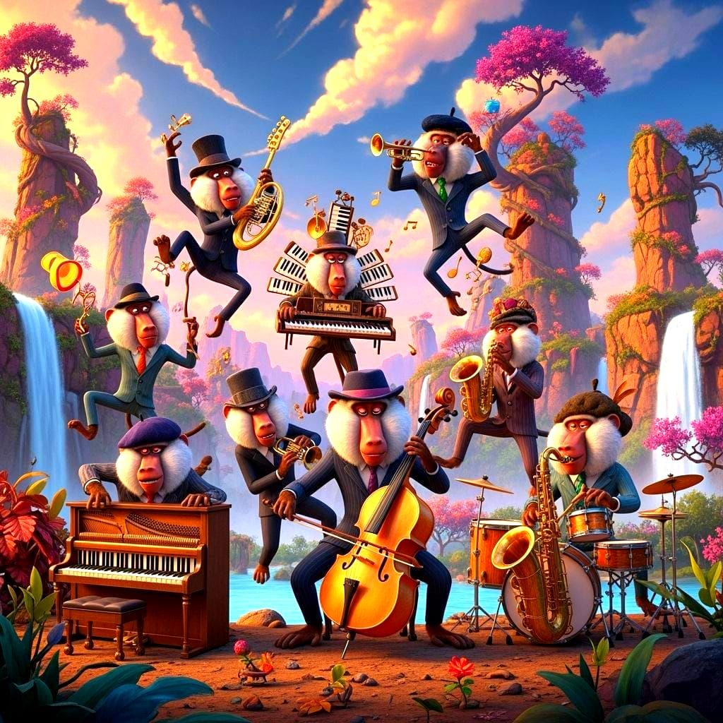 This image shows chacma baboons in tailored suits and hats, playing instruments in a Magaliesberg landscape. The 3D cartoon art style shows dynamic poses with vibrant colors and patterns.