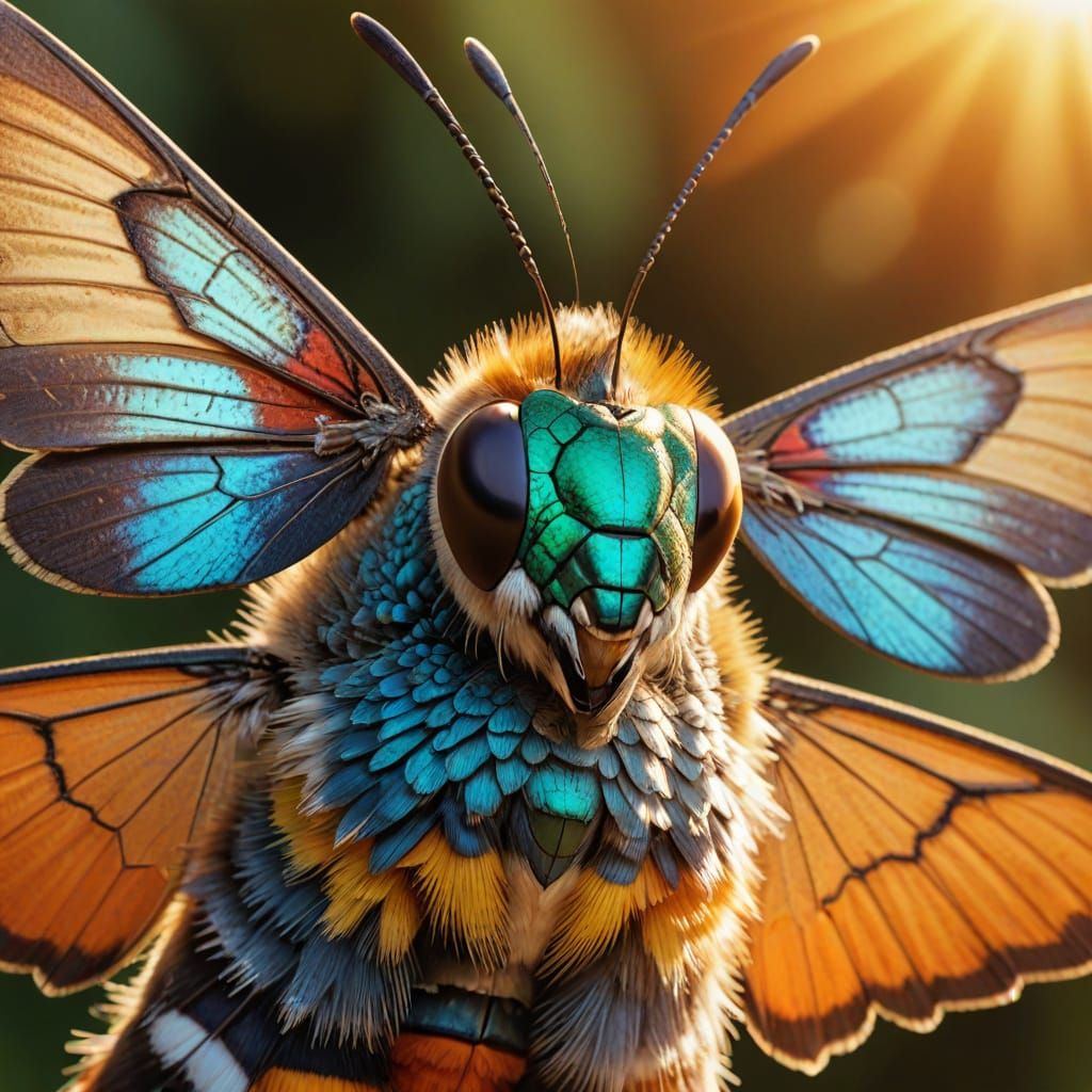 This image shows a hummingbird hawk moth on a bird's head in a macro photograph. The digital art features iridescent wings and soft feathers, illuminated by warm sunlight during the golden hour.