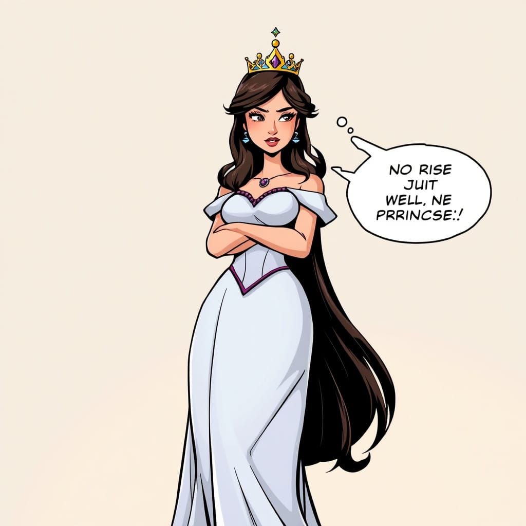 This image shows a determined princess standing confidently, expressing her thoughts in a vibrant comic book art style with bold lines and smooth colors, breaking free from stereotypes and expectations.