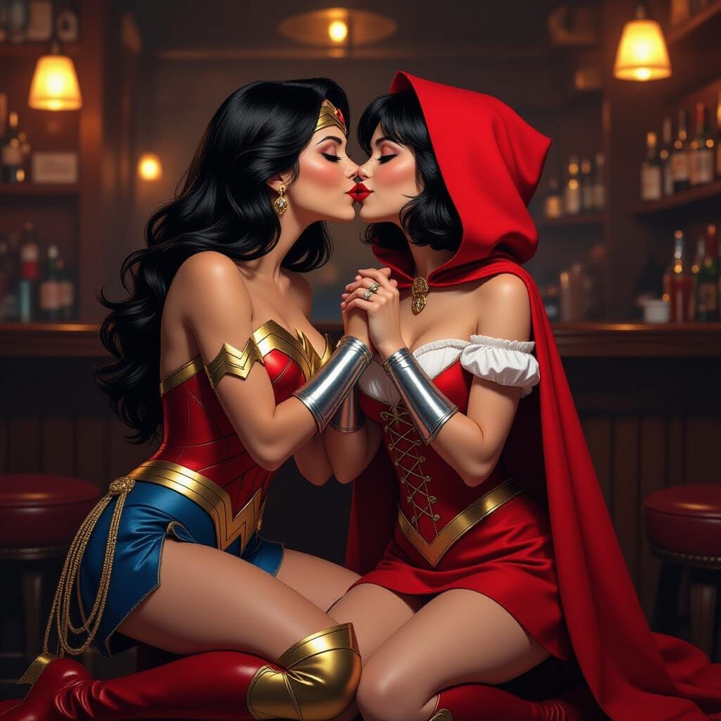 This image shows Wonder Woman and Little Red Riding Hood sharing a kiss in a dimly lit bar. The comic book art is highly detailed, with an aesthetic inspired by classic comic styles.