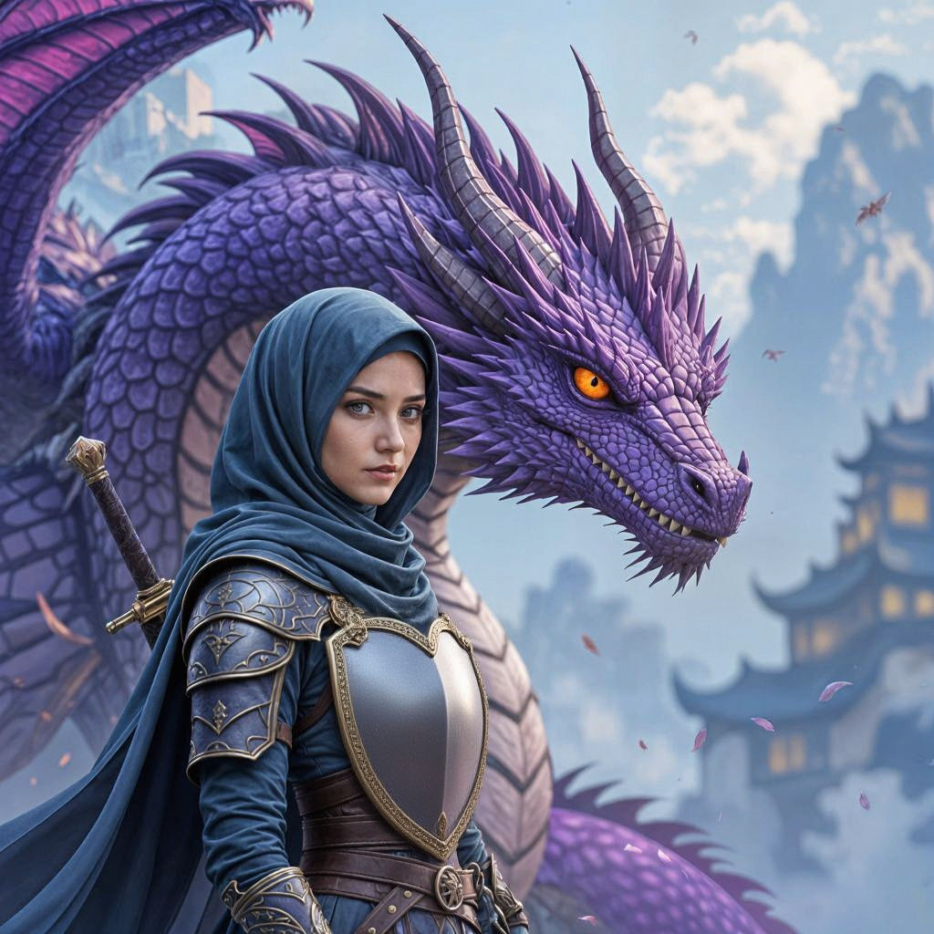 This image shows a portrait of a woman wearing a hijab, with the face of a purple dragon subtly incorporated into the design. The image focuses primarily on the face and head covering.