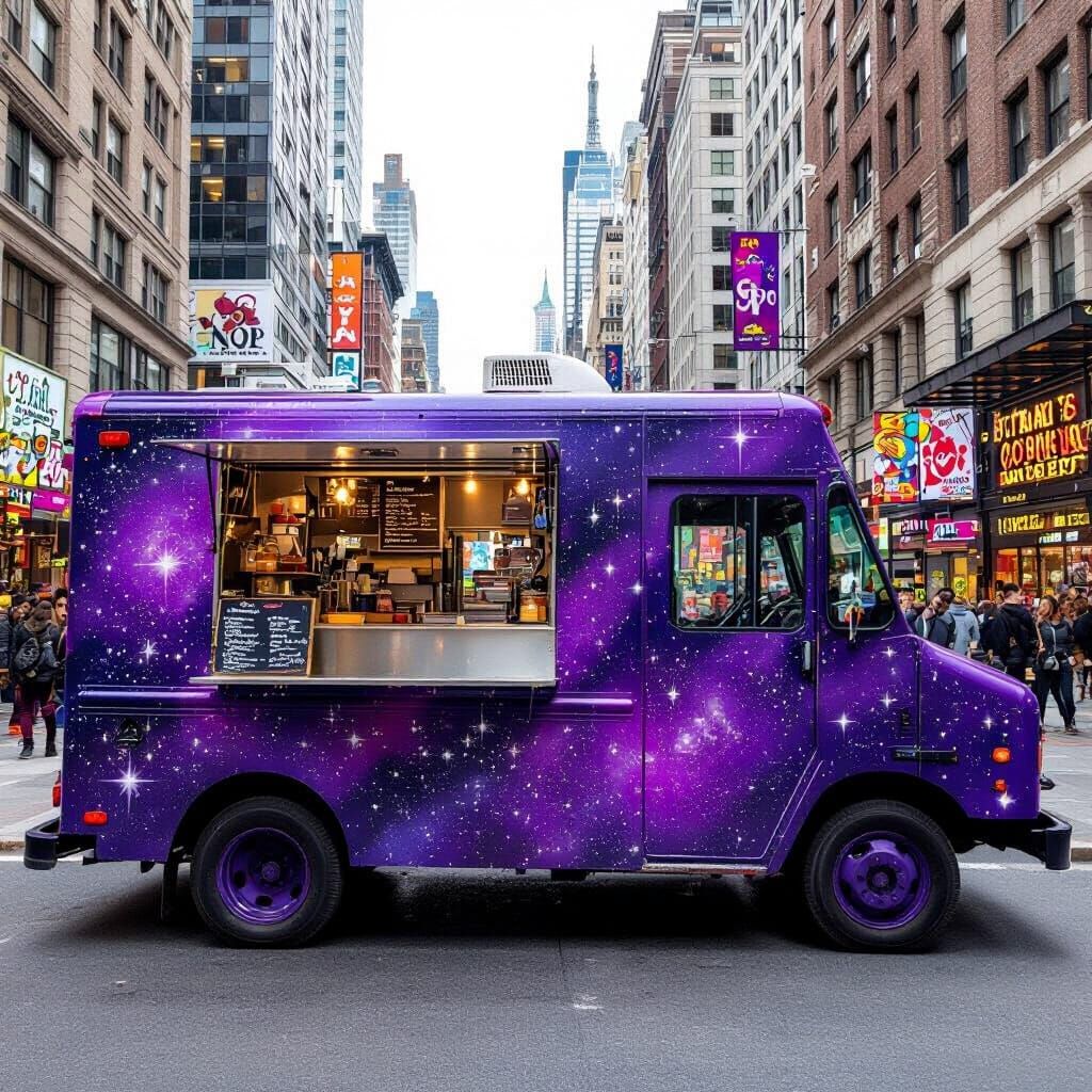 A vibrant purple food truck adorned with galaxy designs serves celestial street food. The image evokes a whimsical style, reminiscent of surrealist art.
