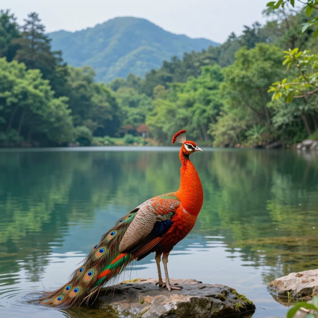 This image shows a majestic peacock with orange-red feathers and blue eyespots standing on a rock by a peaceful lake. Distant blue mountains and a dense green forest form the background, captured in a detailed digital matte painting style.