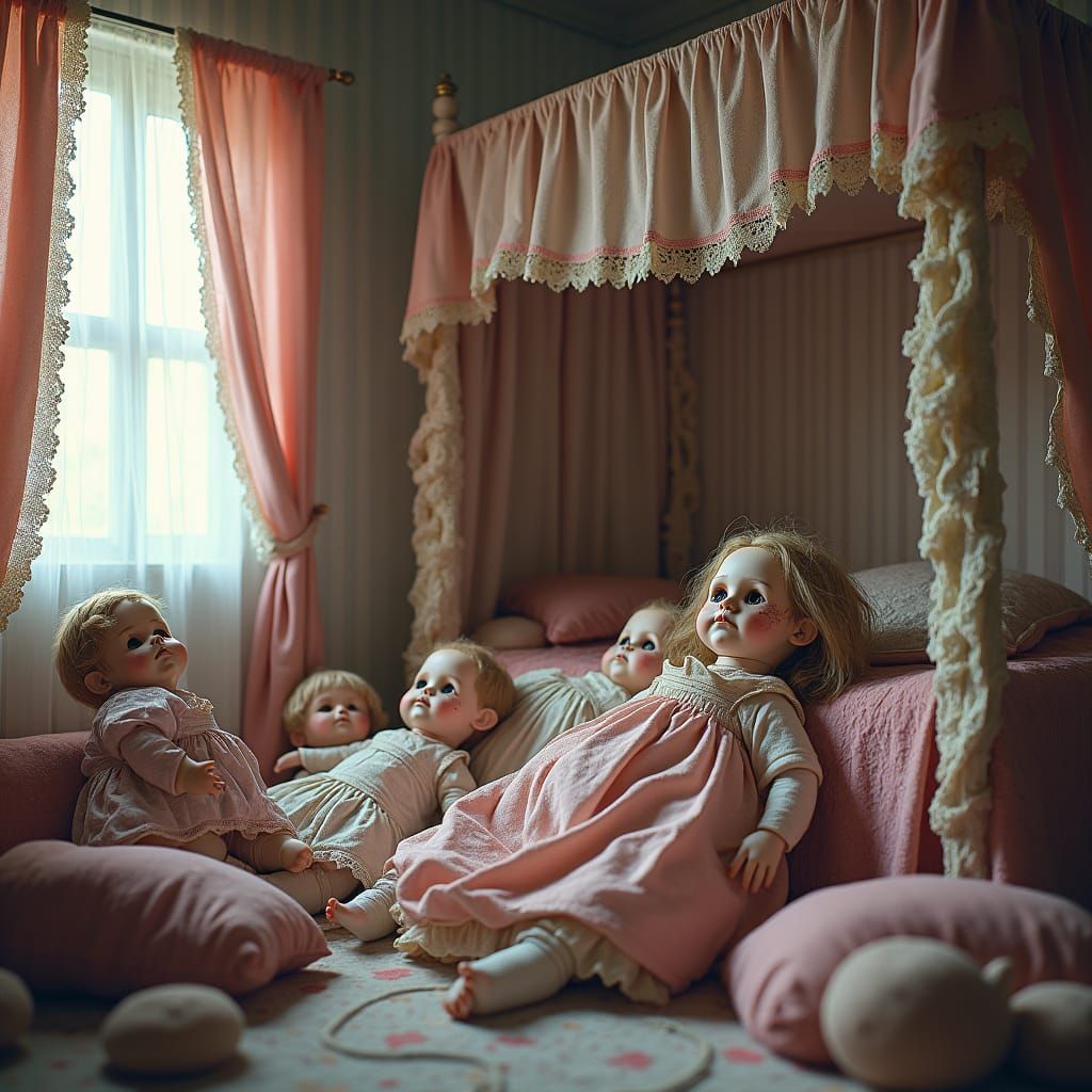 This image shows creepy antique dolls scattered across a pastel pink bedroom. The detailed matte painting, rendered in 8k, blends dark fantasy and whimsy with rich colors and intricate textures.