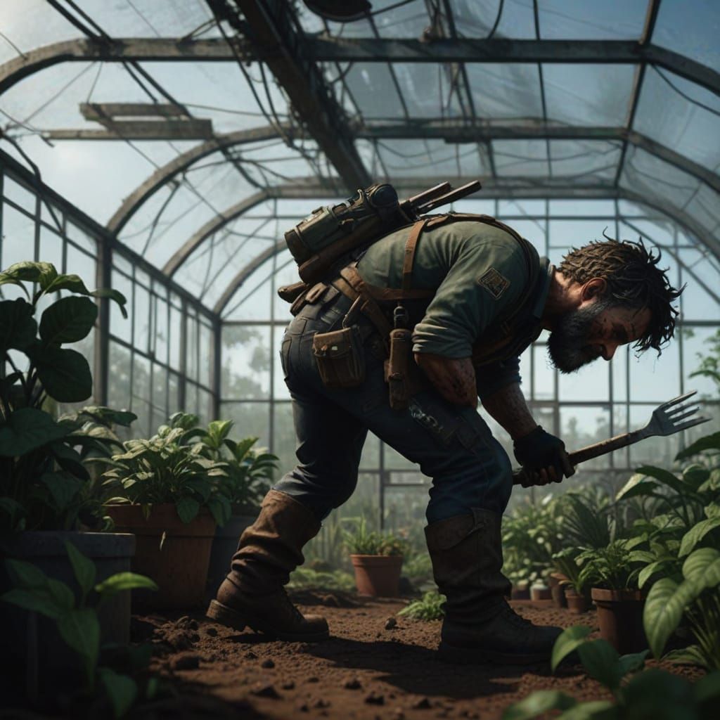 This image depicts two individuals working tirelessly in a greenhouse and garden, surrounded by lush greenery and vibrant colors. The gritty comic book style is characterized by high-contrast lighting, dynamic shadows, and intricate textures, evoking a sense of intensity and drama.