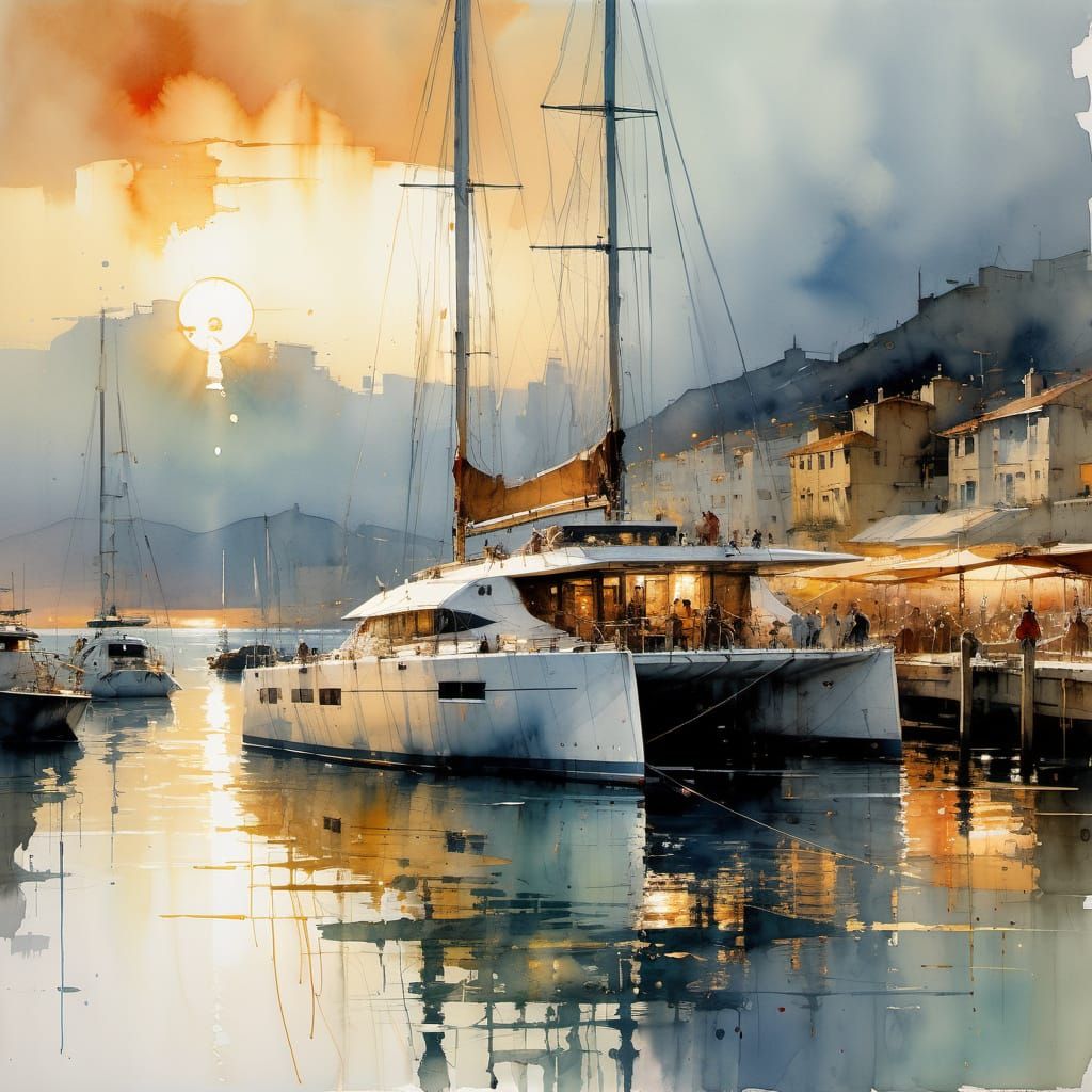 A stunning watercolour painting of a catamaran at a marina during golden hour, featuring expressive brushstrokes and rich textures, capturing the beauty and drama of the scene with ultra-high fidelity detail