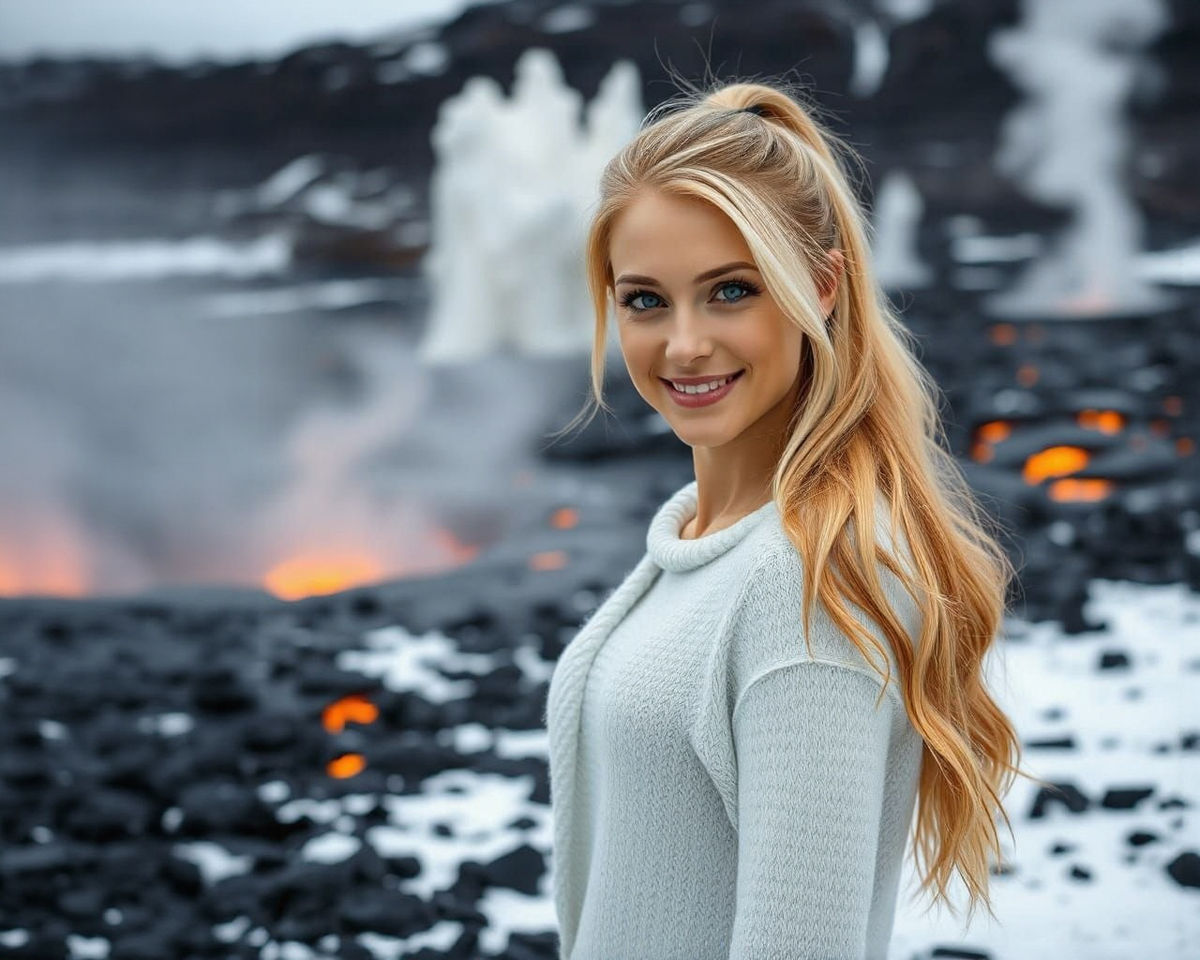 A hyperrealistic image of a smiling blonde woman with blue eyes in Iceland's dramatic volcanic terrain, featuring lava, geysers, and snow.