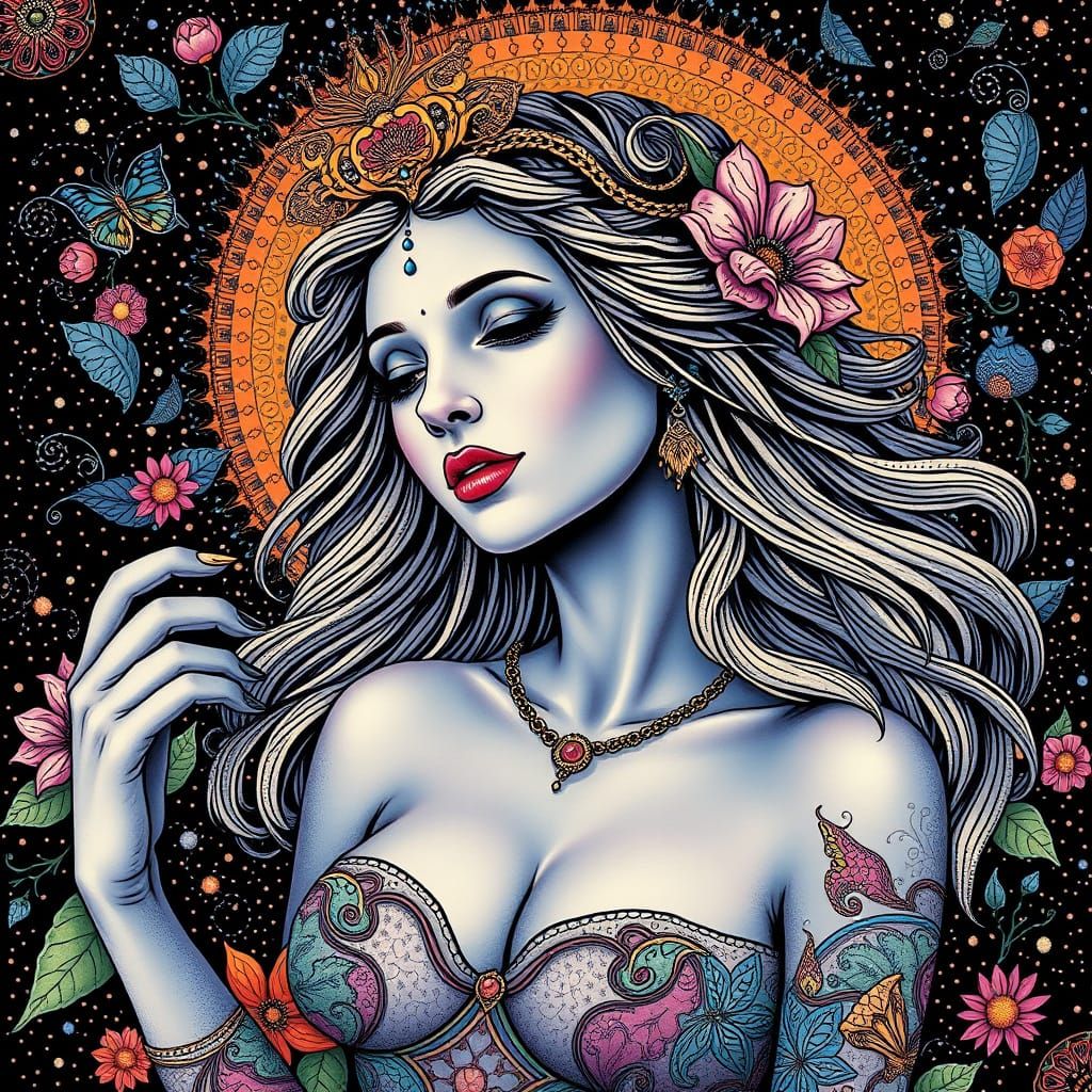 A digital rendering of Aphrodite as an elemental spirit. The artwork features psychedelic colors, elegant botanical zentangle patterns and thin lines in a Kandinsky style.