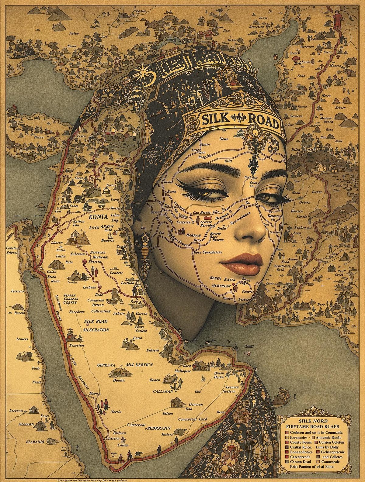 A conceptual image of a woman's face blended with an antique map of the Silk Road. The artwork evokes historical cartography with cultural and geographical details in warm, earthy tones.