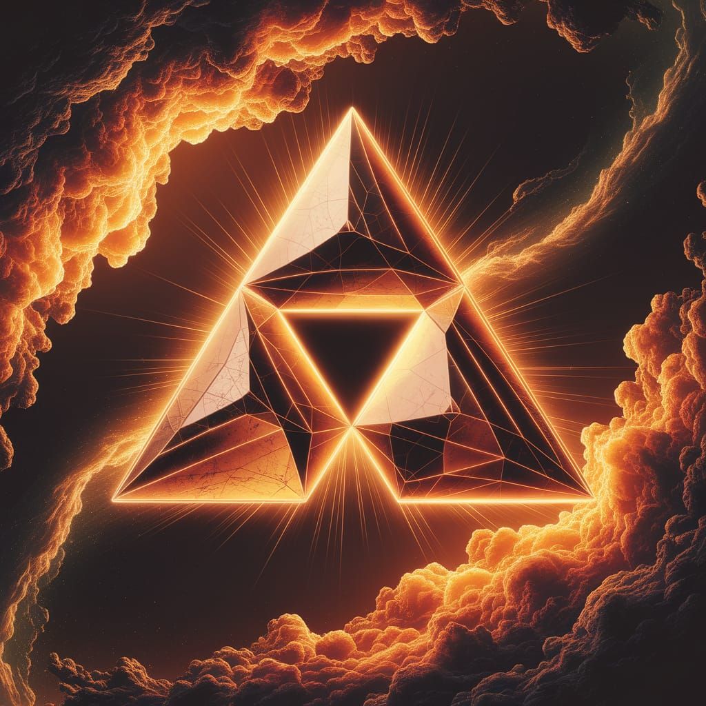 This image shows a glowing Triforce symbol set against a cosmic background. The digital painting uses warm colors and detailed textures to create a high-fantasy aesthetic. The artwork has a splash screen quality.