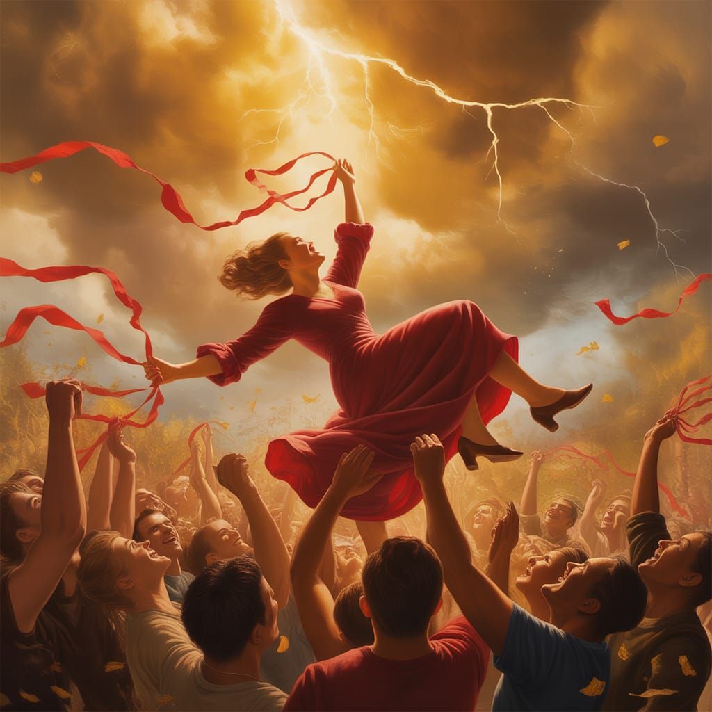 This image shows a woman in a red dress being lifted by a crowd as the sky cracks open with light. The scene blends celebration with dramatic, painterly elements and contrasts warm and cool light.
