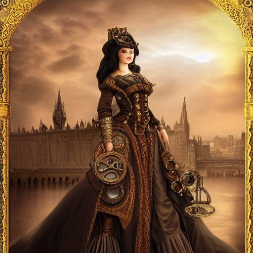 A digital painting of a Spanish queen in steampunk attire. The image features intricate details, dramatic lighting, and a maximalist aesthetic, creating a captivating and cinematic atmosphere.