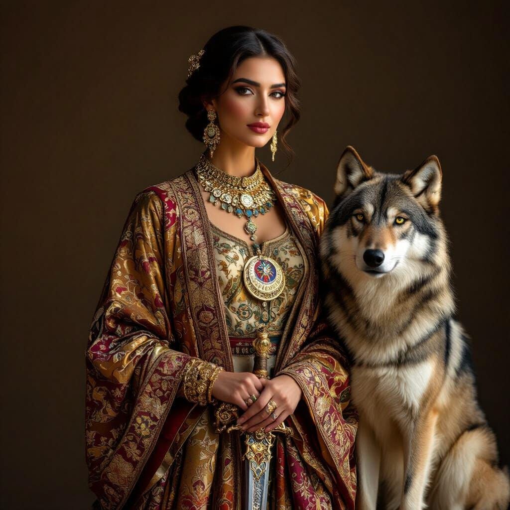 This digital painting depicts a regal Ottoman woman in jewel-toned silk, holding a kilij sword. A loyal wolf stands beside her, bathed in warm golden-hour light, showcasing rich textures and historical aesthetics.