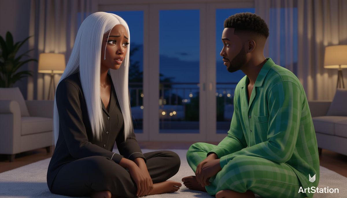 This image depicts a tense, emotional scene: a woman with white hair, showing fear and tears, is comforted by a man in a lavish apartment. The cinematic style uses dramatic lighting and 3D rendering.
