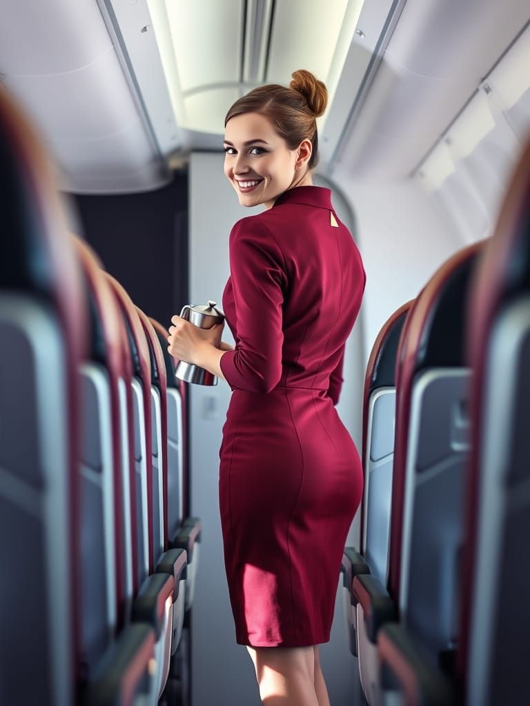 This image captures a candid moment on a daytime flight. A stewardess with a warm smile offers coffee to passengers. Natural light fills the cabin, highlighting her burgundy uniform.