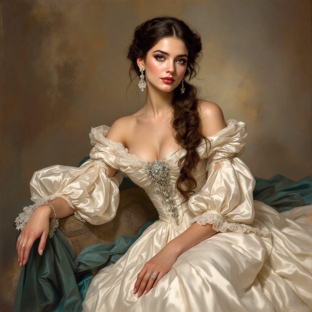 This image is a grand formal portrait of a woman in an ivory silk historical gown with lace trim. It features dramatic lighting, rich textures, and elegant idealization, reminiscent of Old Master techniques.