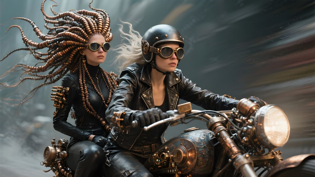 This image shows two female bikers speeding along a road. The driver has long flowing braided hair, while the passenger behind her has metallic steampunk-style tubes for hair, creating a surreal and hyper-realistic effect.