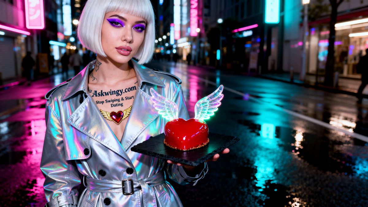 A striking image of a woman with platinum bob hair and bold makeup under Shinjuku's neon glow. She wears a shimmering holographic trench coat, with a wet, reflective street scene.