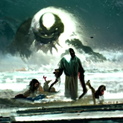This image shows a surreal scene of Jesus Christ on a beach, a jumping frog, and a woman reading the bible. A sinister bowling ball monster emerges from the sea.