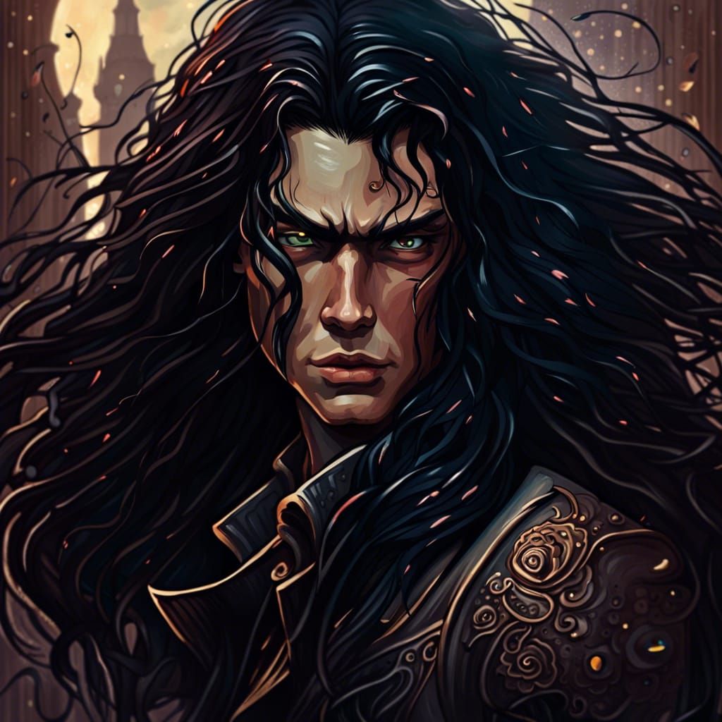 A striking picture of a slender man with long black hair and sharp features, shielding a girl with long curly brown hair. The image is a detailed matte painting with deep colors, rendered in a fantasy concept art style.