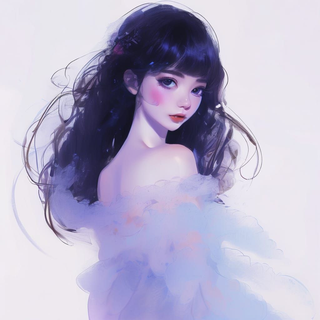 This image features a girl with dark hair and a petticoat dress, rendered with gestural digital strokes and luminous layers. It has a painterly, impressionist feel, avoiding quaint aesthetics and dark colors.