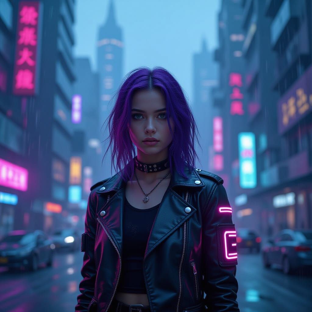 This image shows a teenager with purple hair in a cyberpunk city. Holographic ads illuminate wet streets in the cinematic film still, which portrays rebellion and resilience in a dystopian world.