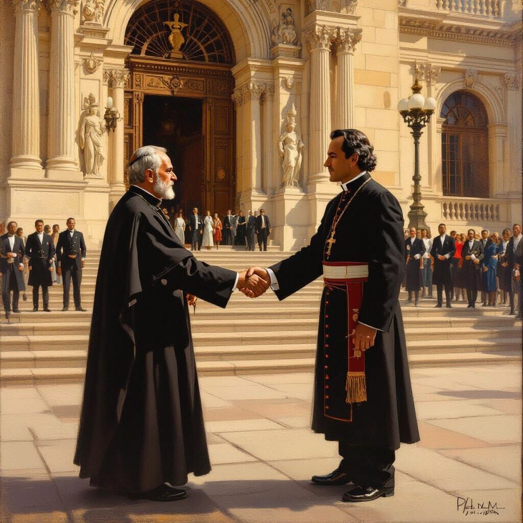 This realistic oil painting depicts Rafael Nuñez shaking hands with a priest before the Palace of Justice in 1886. It features warm, era-appropriate tones and detailed architecture, with lighting that casts long shadows.