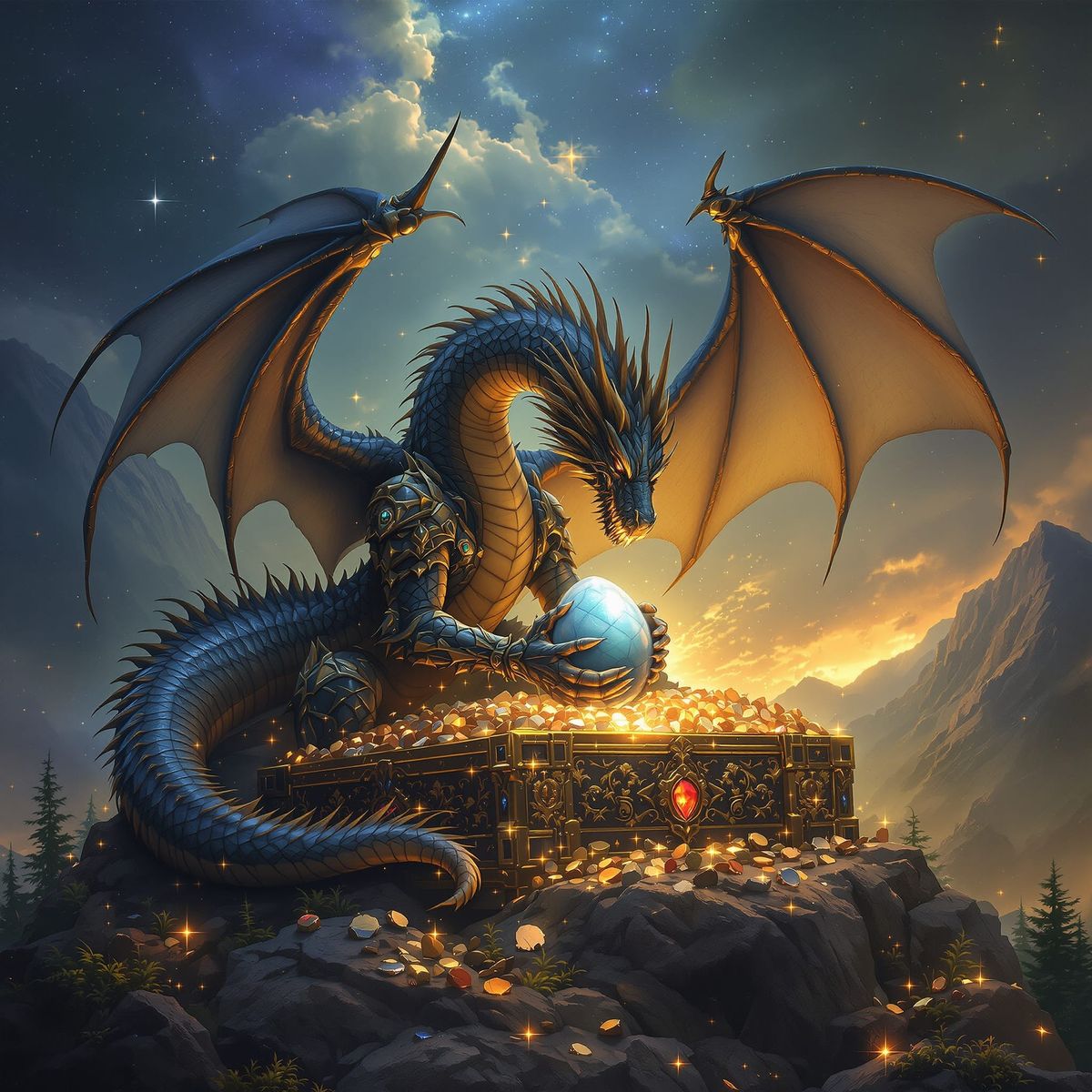 This image shows a dragon atop a mountain of treasure in a rich forest. The dragon sits atop its hoard, nursing an even greater treasure: a dragon egg, with starlight sparkling off jewels.