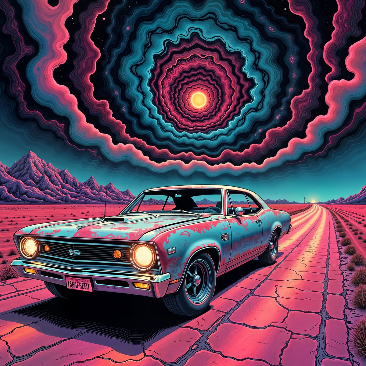 A hyperrealistic image of a vintage muscle car with neon psychedelic patterns driving on a desert highway at twilight, under a swirling cosmic sky with alien elements.