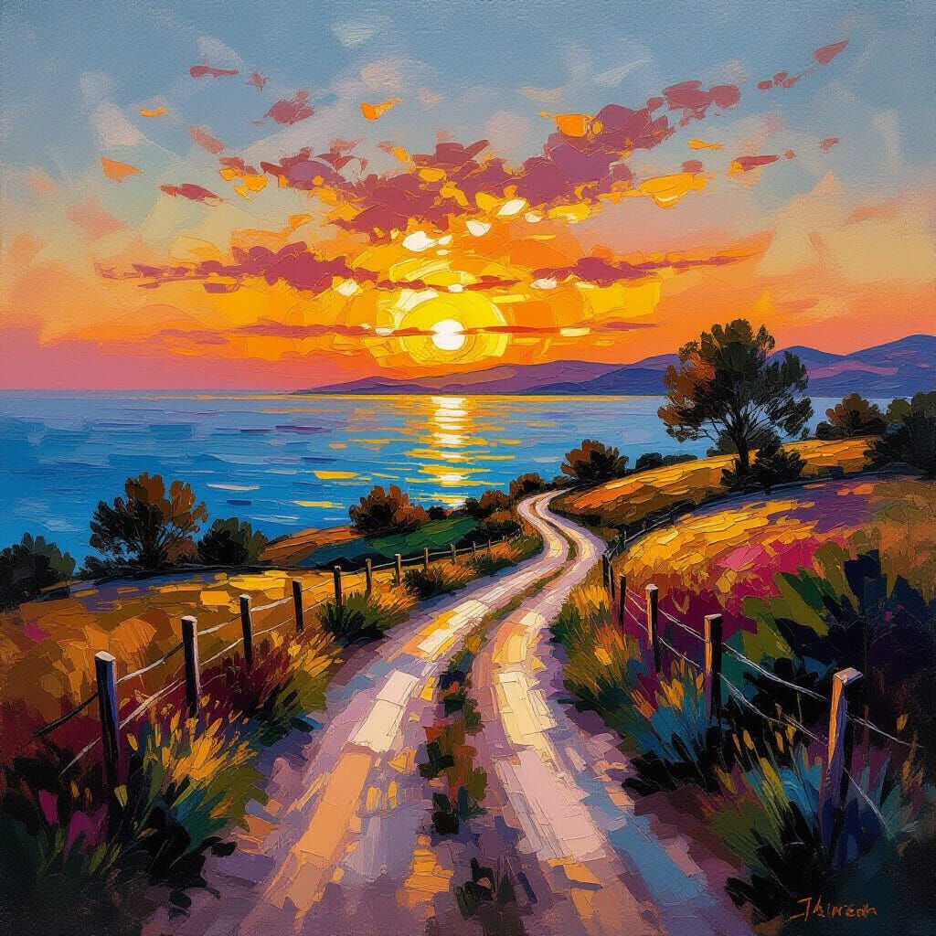 This acrylic painting on hardboard features thick, textured brushstrokes depicting a country road leading to a golden sunset over the ocean. Inspired by Monet and Turner, it uses vibrant colors and dynamic light.