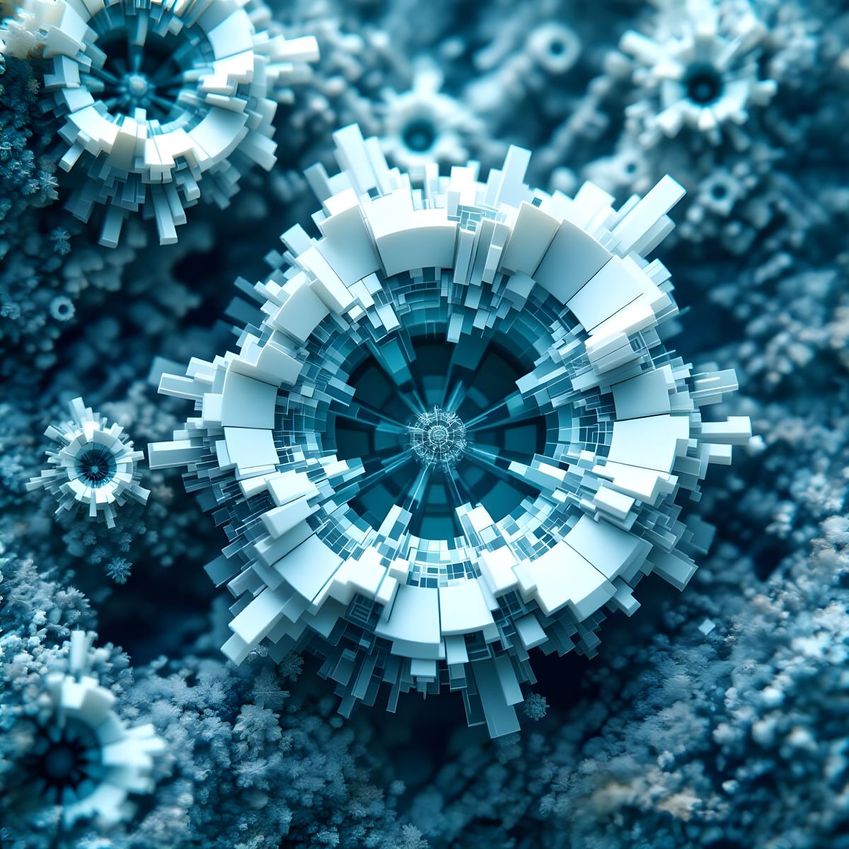 Ultra-detailed macro-scale visual composition of microscopic entity-like structures formed from segmented modular shapes. Repeating multi-part forms resembling articulated micro-constructs, composed of translucent crystal, matte mineral surfaces, ceramic-like shells, metallic joints, and glass membranes. ...