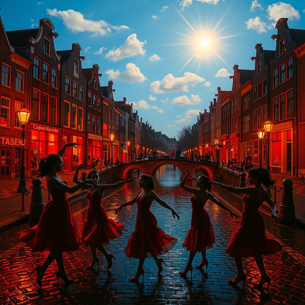 This image depicts shadowless women in red dresses dancing at night under neon lights, juxtaposed with a bright, sunny daytime sky, creating a surreal high-contrast scene.