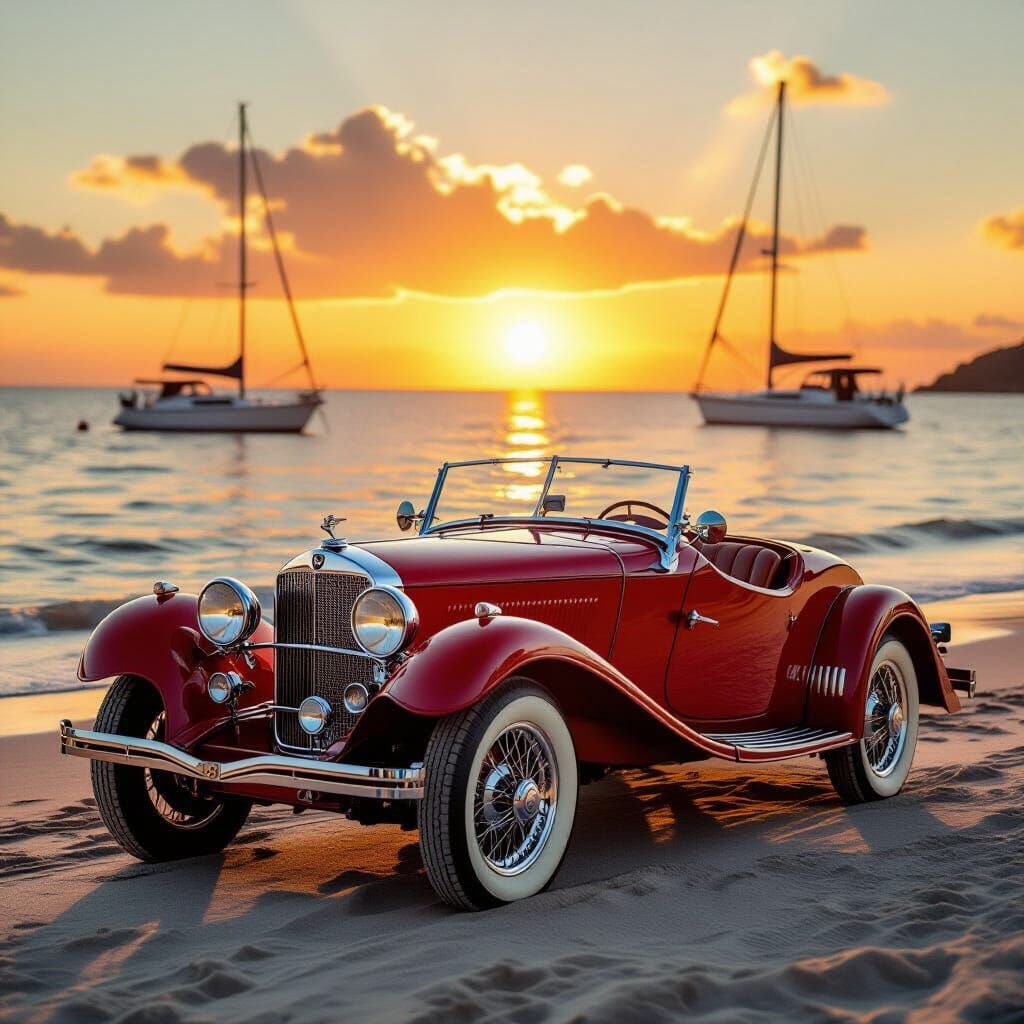 This image shows a classic bright red 1930s sports car parked on a beach during a golden hour sunset. Luxury yachts are visible on the calm sea in the background.
