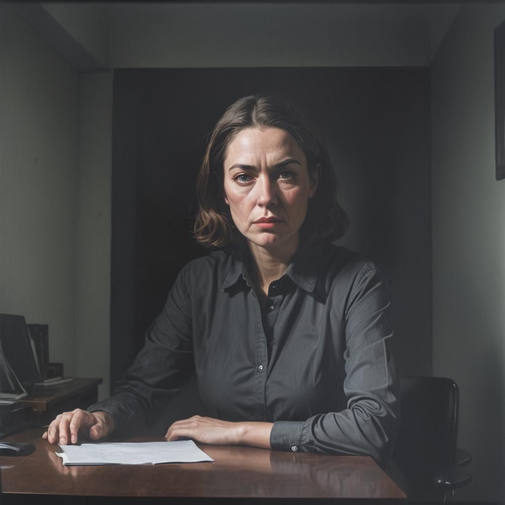 This image shows a man at a desk in a dark room, with a large female face superimposed. The photorealistic image features a small window as a light source.