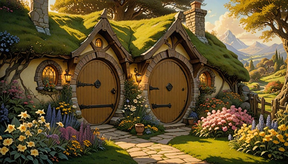 A whimsical hobbit house entrance bathed in golden light. The scene is framed by a garden gate and vibrant flowers, reminiscent of classic fantasy art.