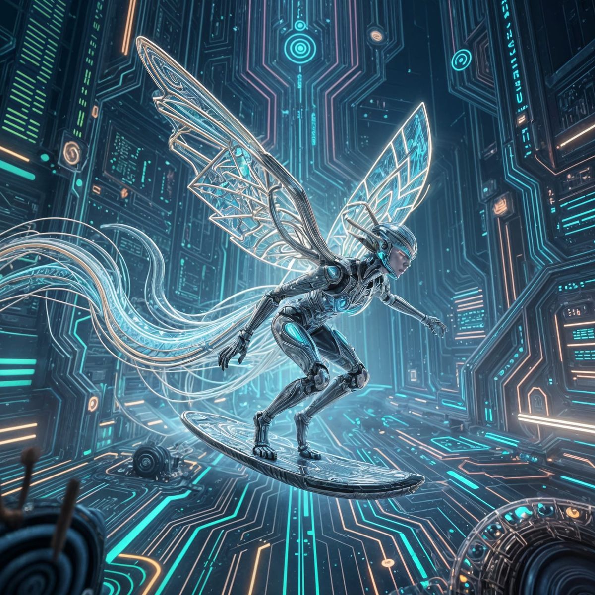 This AI-generated image depicts mystical beings navigating the abstract flow of Python code within a complex electronic housing. A digital art representation of consciousness and technology.