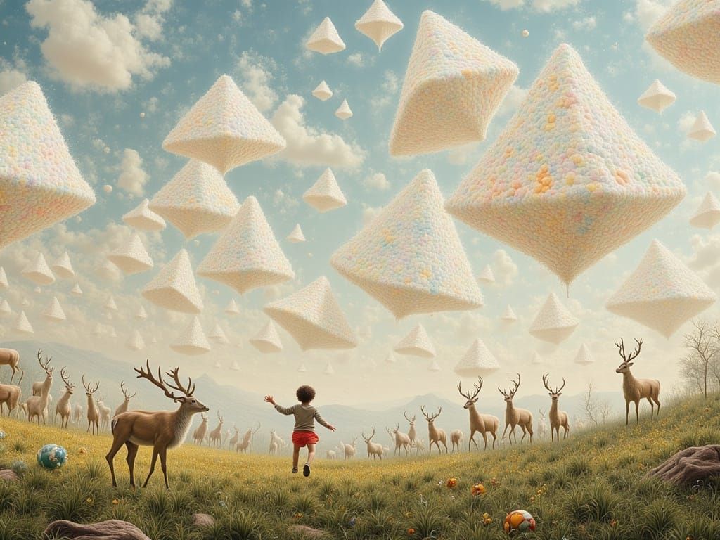 This image depicts a serene and fantastical meadow scene with oversized, glowing tetrahedrons suspended above the grass, reflecting fractured light and sky hues. A lone child runs beneath, surrounded by motionless deer, in a soft pastel-toned, painterly landscape.