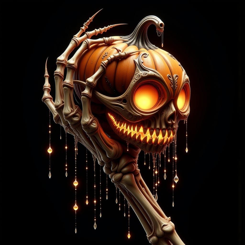 This dark fantasy illustration features a skeletal hand with ornate jewelry nails holding a grinning pumpkin skull. The gothic macabre scene uses chiaroscuro lighting for a haunting, supernatural effect.