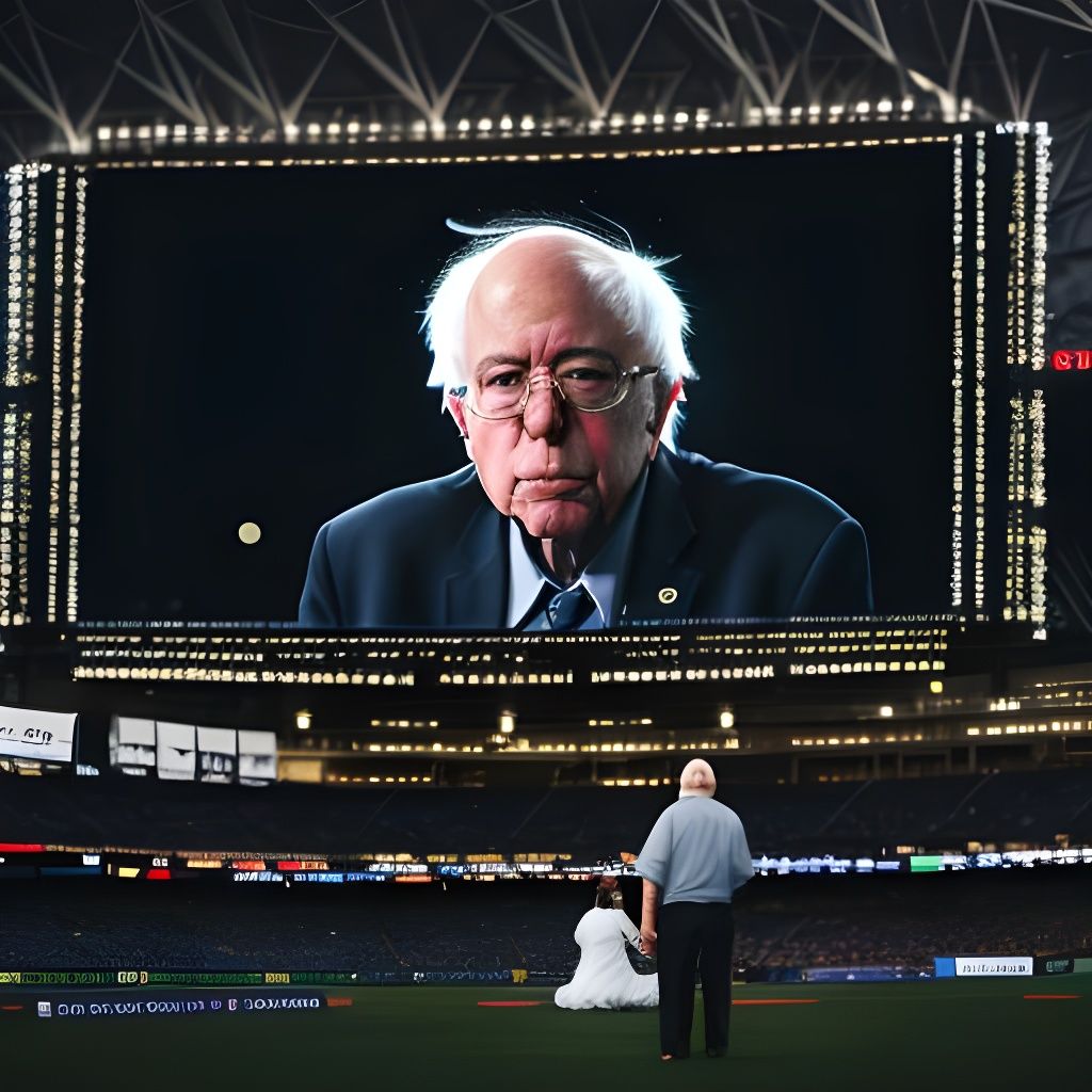 A striking picture of Bernie Sanders standing on the big screen at the McG under a grey starry night sky, captured with professional photography and a Canon DSLR in sharp focus.