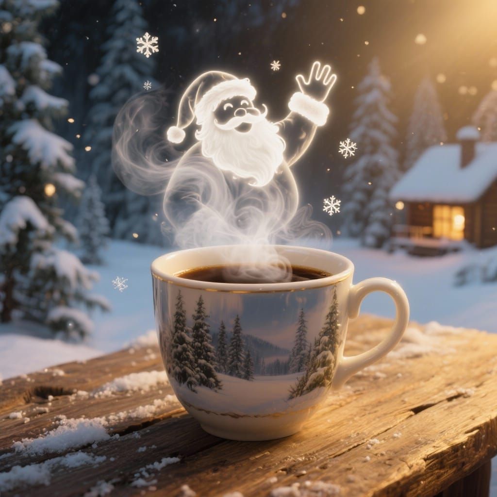 This image features a detailed ceramic coffee cup on a rustic table. Steam rises, forming Santa Claus, with soft snowflakes in a magical realism style.