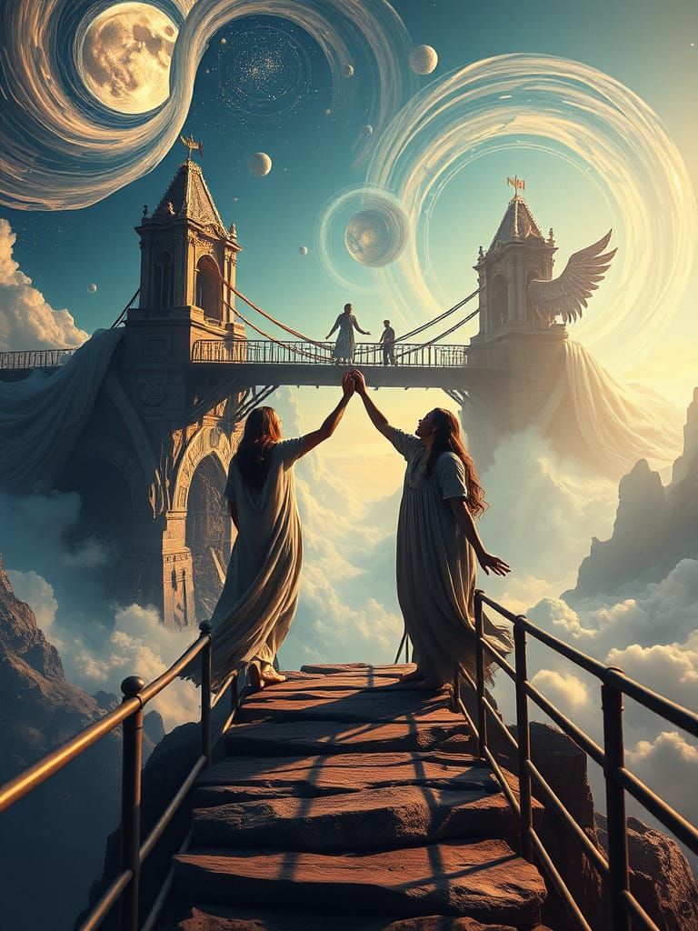 This image depicts a majestic bridge spanning two worlds, symbolizing unity and solidarity among friends from different dimensions, surrounded by swirling, iridescent particles and a cinematic film still aesthetic, reminiscent of surrealist art and 35mm film grain texture.