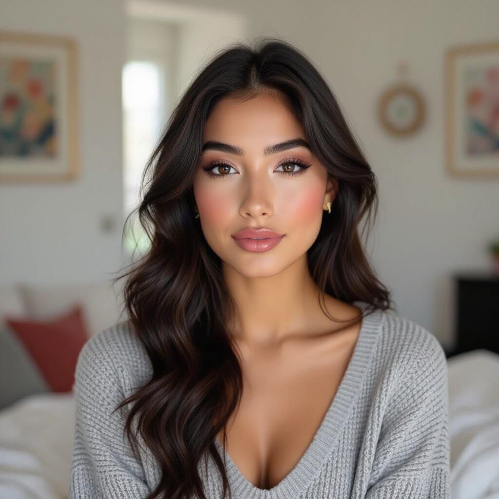 This image shows a photorealistic portrait of a young Latina woman with dark hair and makeup, set against a bedroom backdrop. She is wearing a gray sweater, rendered with great attention to detail.